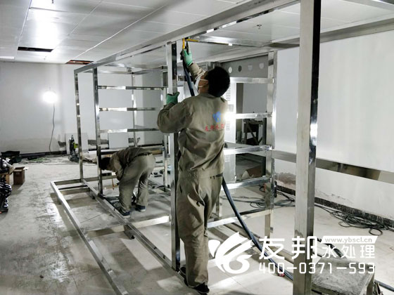 如圖以下就是鄭州友邦師傅們在嘉禾國際酒店正在組裝,安裝設備的圖片。這套設備有48大支RO反滲透膜組成,具有安裝調試方便,運行穩定,自動化程度高等特點。